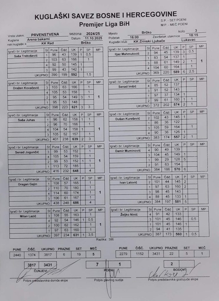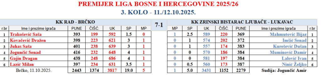 U okviru trećeg kola Premijer lige Bosne i Hercegovine, ekipa Kuglaškog kluba “Rad” je u kuglani Arena Bakarni dočekala ekipu KK “Zrinski Bistarac Ljubače” iz Lukavca. Brčaci su u ovu utakmicu ušli kao apsolutni favoriti za bodove a večerašnja noć će im zasigurno ostati u pamćenju.
