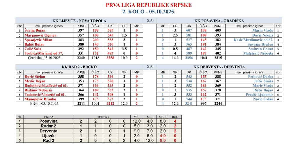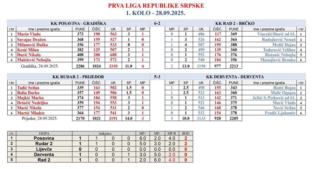 Nakon prva dva kola šampinata Republike Srpske u kuglanju, ekipa Posavine iz Gradiške trenutno drži lidersku poziciju na tabeli sa skorom 2-0! Na premijeri u Gradišci savladali su ekipu Rad 2 – Brčko oborivši 3310 čunjeva a u nedeljnom gostovanju protiv ekipe Lijevča – takođe u Gradišci, zabilježili su i drugu uvjerljivu pobjedu sa 98 čunjeva razlike rezultatom 6-2. Posavina iako je oslabljena neigranjem Tartića i Svračića koji su prešli u Adu, pored Rudara i Dervente zasigurno je favorit za prvo mjesto ali ono što mora svima biti jasno na samom startu prvenstva je to da ekipe Rad 2 i Rudar 2 nemaju pravo učestvovati u Premijer ligi u slučaju prvog mjesta, tako da samo Derventa, Lijevče i Posavina mogu da se plasiraju u viši rang takmičenja.