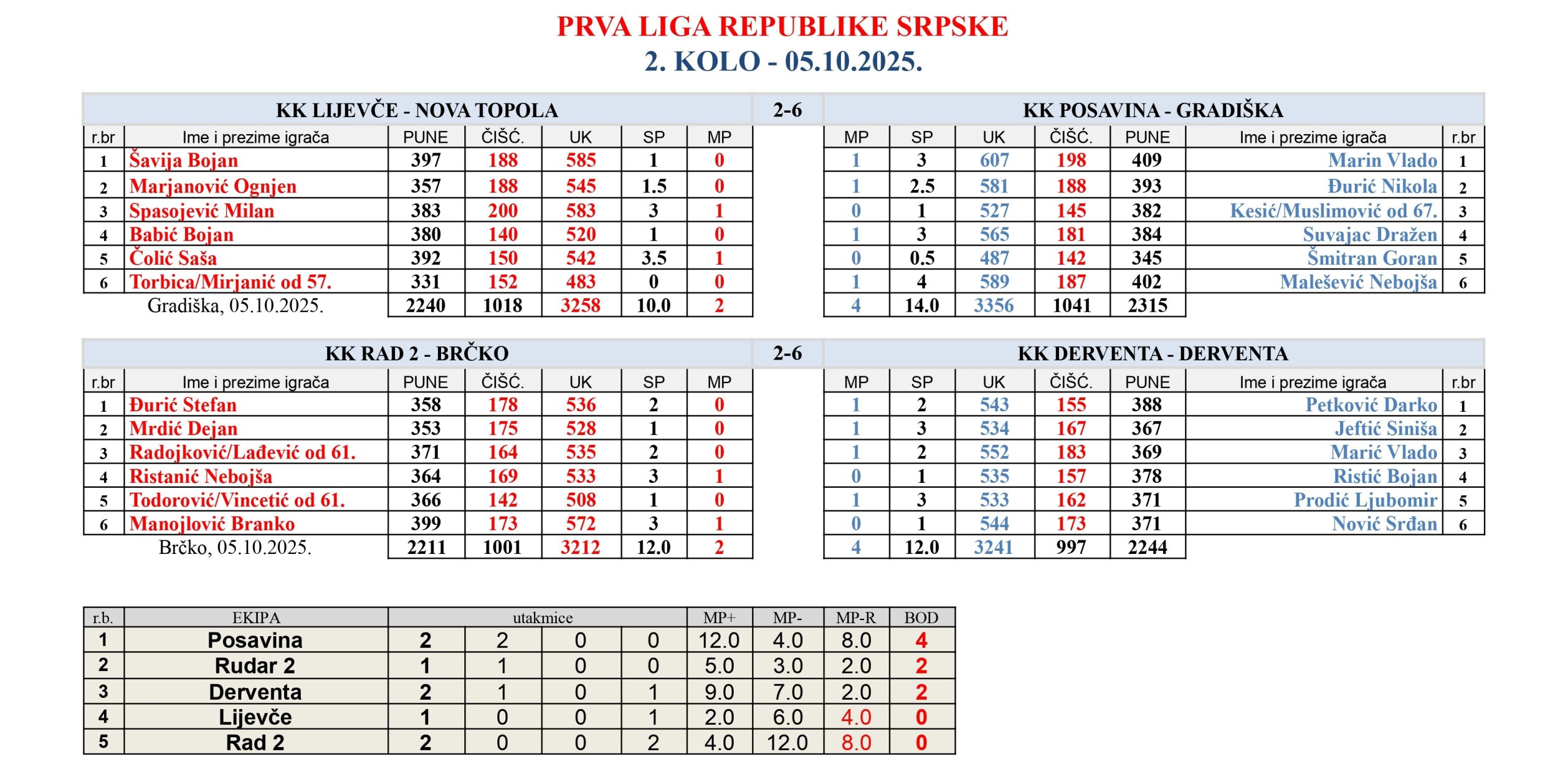 Rad 2 ima dva poraza (u nedelju od Dervente) i od Posavine. Najzanimljivija dešavanja će biti sa Prijedorskom ekipom koja igra sa gradiščancima u okviru petog kola a kolo prije Posavina ide u goste Derventi tako da će nam poslije 26. oktobra neke stvari biti jasnije.