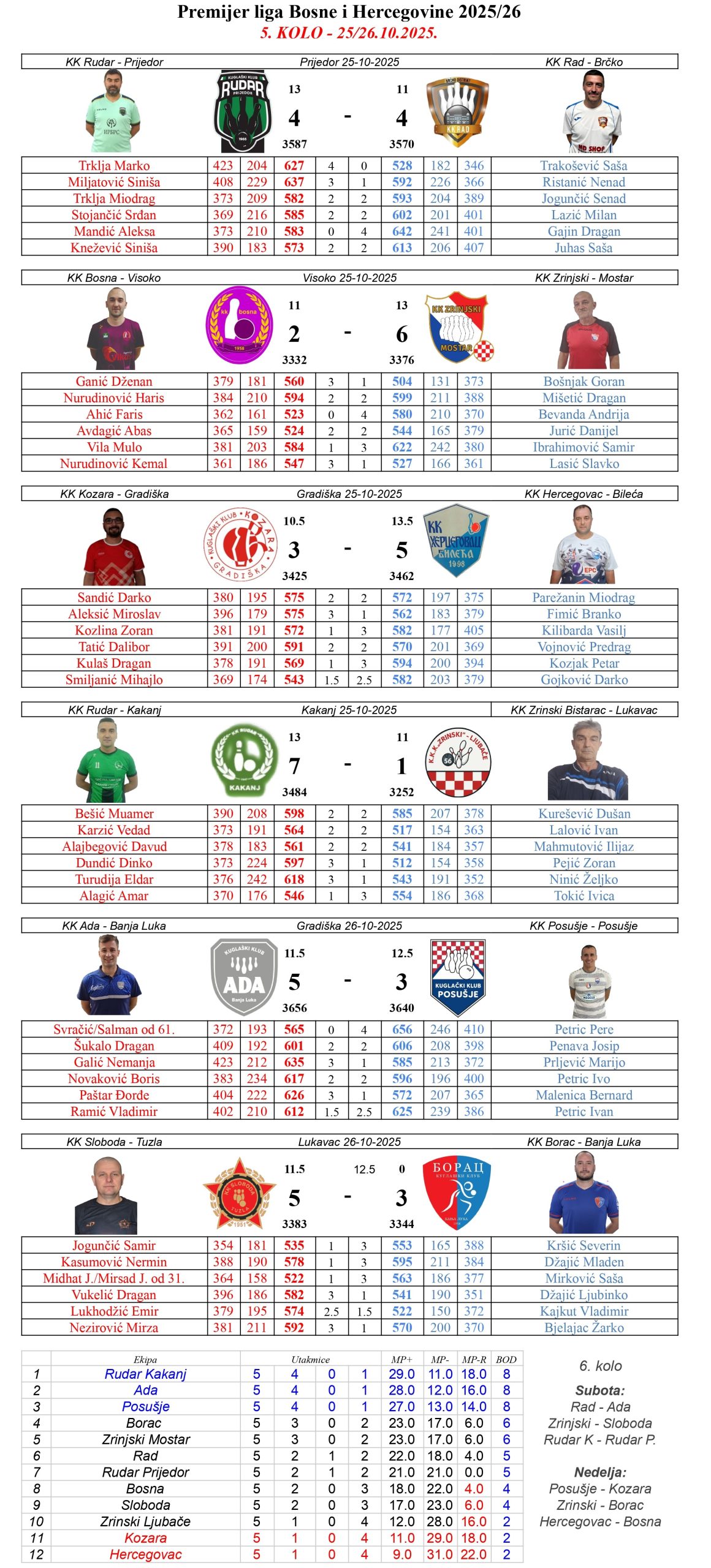 Posušje na kuglani Bagušić nije poraženo unazad osam godina, a sa tim statističkim podatkom rijetko koja ekipa iz svijeta se može pohvaliti. Sjajnu utakmicu su u nedelju priredili poblici u Gradišci gdje su na kraju izašli kao poraženi. I ove godine braća Petric kao nosioci ekipe se zasluženo nalaze u samom vrhu tabele za igrača lige sa prosjekom od preko 600 čunjeva u pet kola. Sutra im u goste dolazi Kozara. Ove godine dosta oslabljeni neigranjem Mandića izgubili su kući od Mostara, od Zrinjskog službenim rezultatom, Sloboda u Tuzli je takođe bila bolja od njih a i Borac im je nanio težak poraz na domaćem terenu. Jedinu pobjedu su upisali u prvom kolu protiv Bosne iz Visokog. Nezgodan raspored ih očekuje i u narednom periodu a trenutno su na začelju sa Hercegovcem.