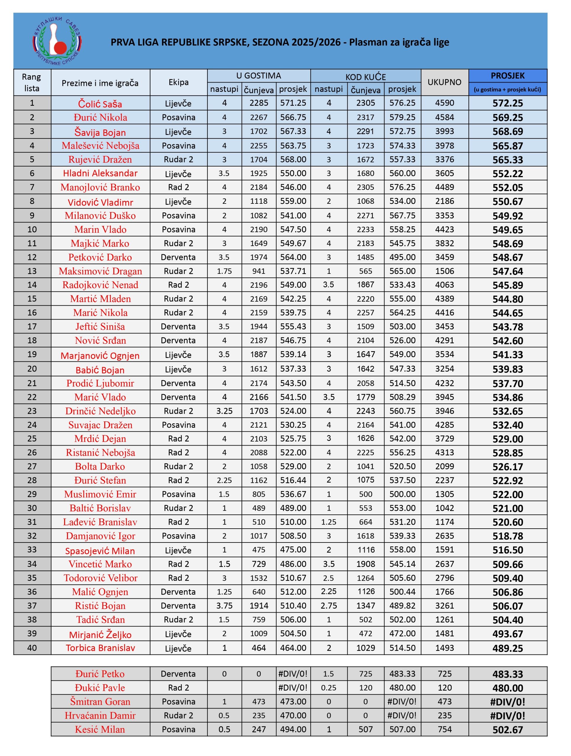 Igrači iz Lijevča, Posavine i Rudara 2 se trenutno nalaze u Top 5 a do kraja sezone je ostalo još 10 kola gdje će svaka ekipa imati još po OSAM utakmica.