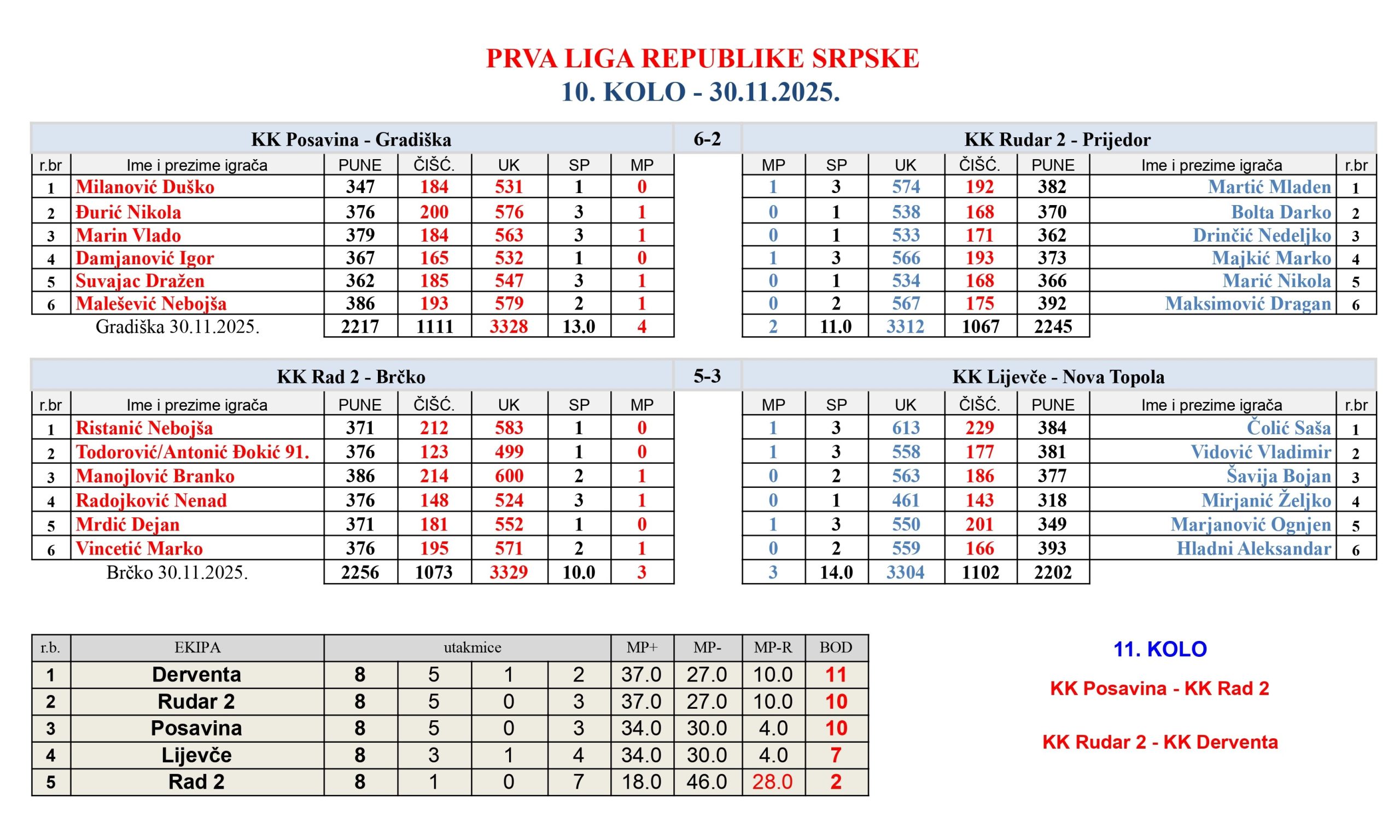 Nakon prvih 10 kola viđali smo brojna iznenađenja na kuglaškim stazama a samim tim padali su i ekipni rekordi. Ekipa Rudara je u okviru devetog kola ugostila Lijevče iz Nove Topole. Slavili su prijedorčani rezultatom 6-2 sa ukupnom cifrom od 3370 što im je ujedno i službeni ekipni rekord.