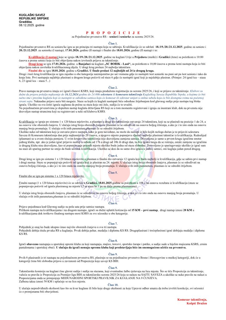 KVALIFIKACIJE ZA POJEDINAČNO PRVENSTVO REPUBLIKE SRPSKE ĆE SE ODRŽATI U GRADIŠCI ZA SENIORKE I U PRIJEDORU ZA SENIORE. SVI DETALJI SU OPISANI U PROPOZICIJAMA KOJE DOSTAVLJAMO ISPOD TEKSTA A ISPOD TEKSTA SE TAKOĐE NALAZI I LINK ZA RASPOLOŽIVOST TERMINA GDJE ĆE SE IGRAČI PRIJAVLJIVATI KOD KOMESARA ILI SEKRETARA.