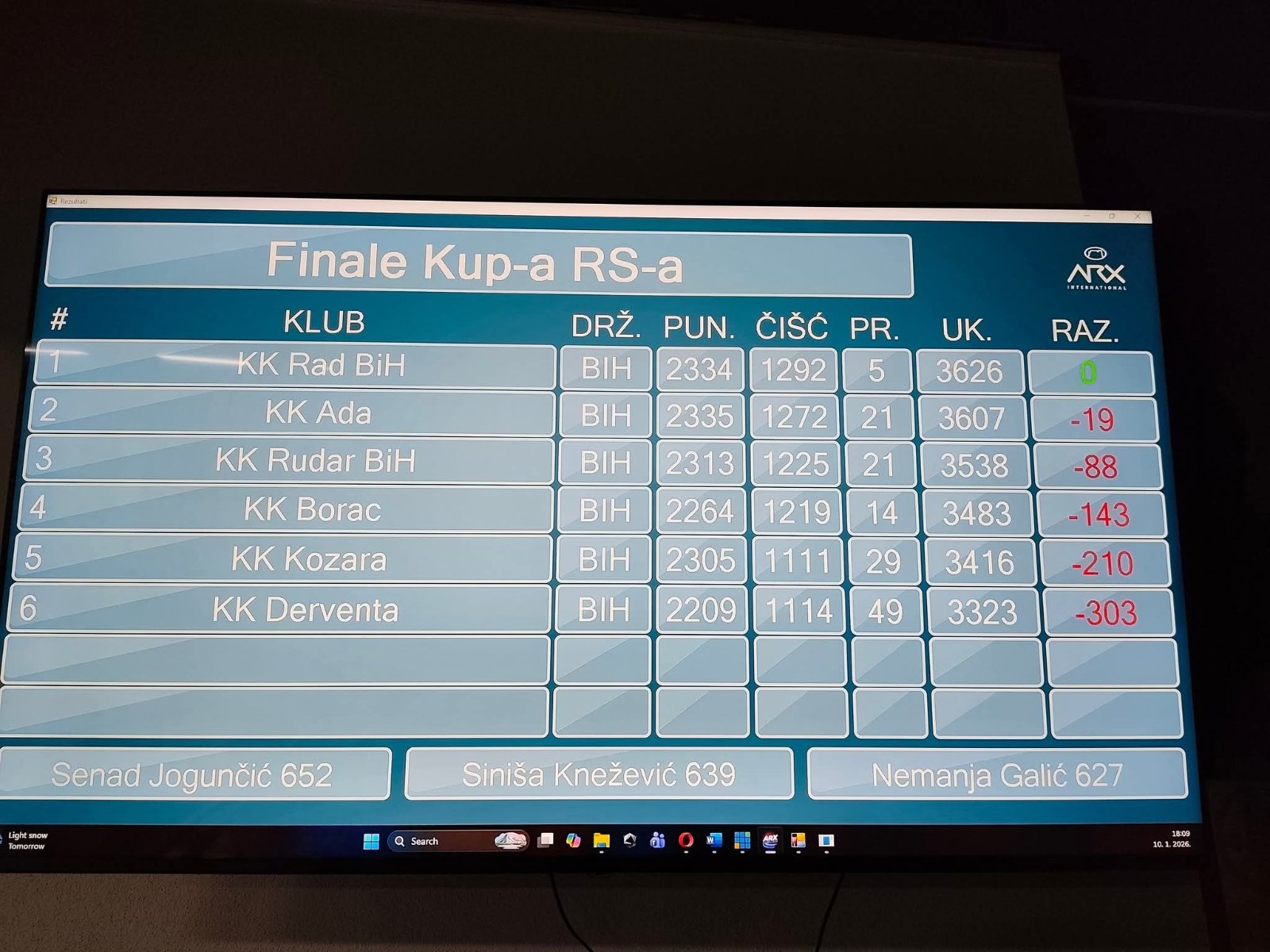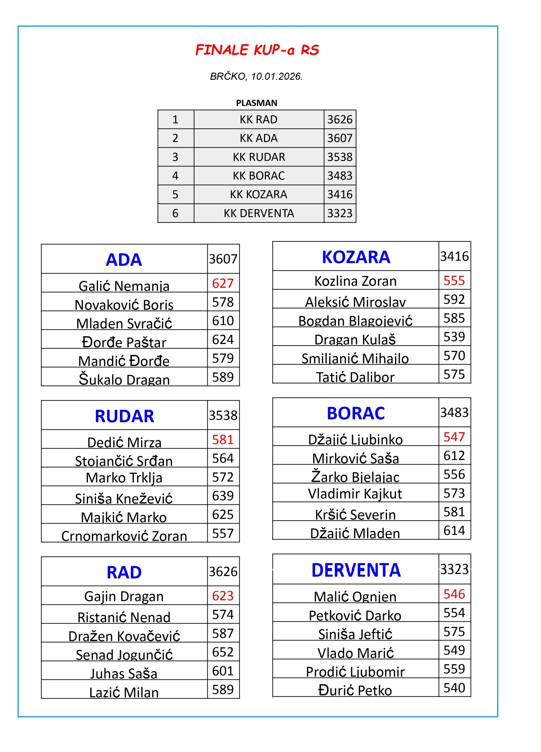 Kao što smo rekli druga je bila ekipa KK Ada Banjaluka čiji je kapiten Galić Nemanja imao drugi rezultat dana – 627. Treće mjesto pripalo je ekipi Rudara iz Prijedora dok su četvrti bili kuglaši Borca. Peto mjesto pripalo je kuglašima Kozare a šesta je bila Derventa.